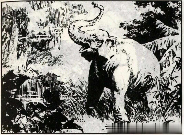 两边的山崖上都是大树,谷底很平。进入山谷后,大象就变得小心翼翼,一边走一边四下张望,似乎对某种东西很忌惮。又走了五六里,来到一棵大树前,像用鼻子指树,猎人明白了它的意图,带着弓箭爬到树上。他在离地十丈的地方停下,大象又指,猎人就一直爬到树梢,大约离地二十丈。象对他注目良久,似予以重托,然后离去。